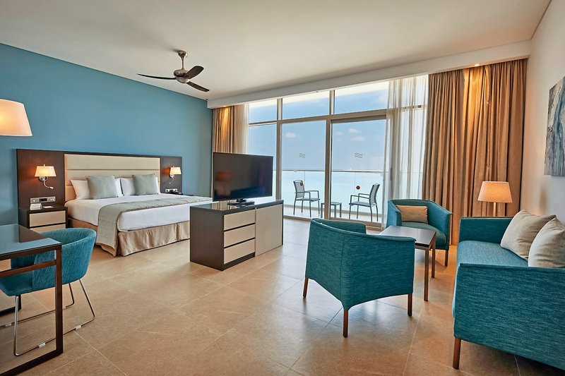 - Family Junior Suite (JSX1), Juniorsuite, seitlicher Meerblick, ca. 52 m², Gesamtanzahl der Räume in diesem Zimmertyp: 2, Aufteilung wie folgt: kombiniertes Wohn-/Schlafzimmer, 1 Schlafzimmer, 2 King Size Betten (180x200cm), 1 Schlafsofa, Klimaanlage: zentral gesteuert, Safe: ohne Gebühr, Wasserkocher, Minibar: Softdrinks: ohne Gebühr, Wasser: ohne Gebühr, Telefon, Internet: WLAN/WiFi: ohne Gebühr, Fernseher: Flatscreen, Sat-TV, Badewanne, WC, Föhn, Kosmetikspiegel, Balkon oder Terrasse: mit Sitzgelegenheit