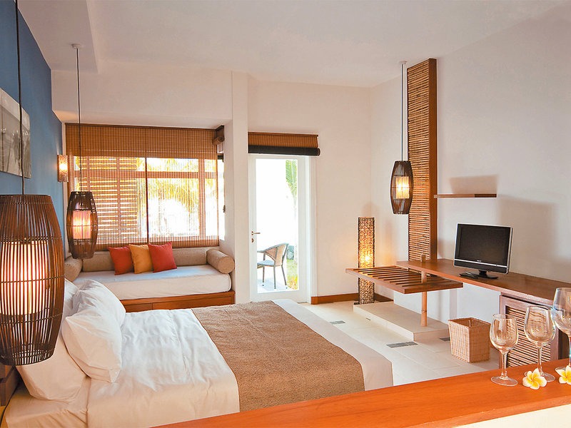 - Barachois (DZX1), Meerseite, Lagunenseite, Gartenblick, Innenhofblick, Blick auf Mountains, ca. 25 m², Gesamtanzahl der Räume in diesem Zimmertyp: 1, Aufteilung wie folgt: kombiniertes Wohn-/Schlafzimmer, 1 King Size Bett (180x200cm), Klimaanlage: ohne Gebühr, individuell regelbar, kalt, Fußboden: Fliesenboden, Safe: ohne Gebühr, Deckenventilator, Sofa, Schreibtisch, Bügeleisen, Bügelbrett, Kaffee-/Teezubereiter, Wasserkocher, Minibar: ohne Gebühr, bei All Inclusive inklusive, Softdrinks: ohne Gebühr, bei All Inclusive inklusive, Wasser: ohne Gebühr, bei All Inclusive inklusive, alkoholische Getränke: ohne Gebühr, bei All Inclusive inklusive, Snacks: ohne Gebühr, bei All Inclusive inklusive, Minibarauffüllung: täglich, Telefon, Internet: WLAN/WiFi, Fernseher: im Schlafzimmer, deutsches Programm, Sat-TV, Kabel-TV, Dusche, WC, Föhn, Terrasse: mit Sitzgelegenheit
