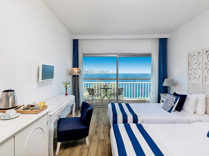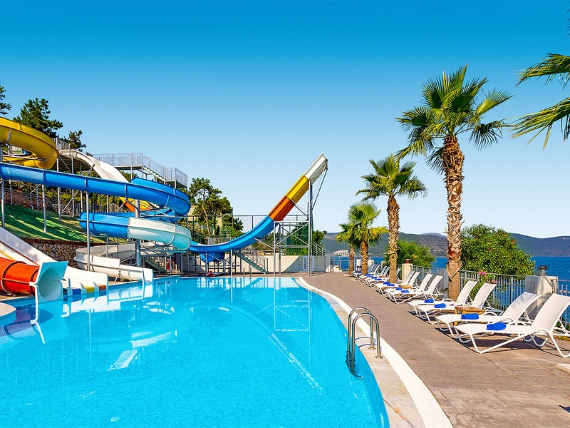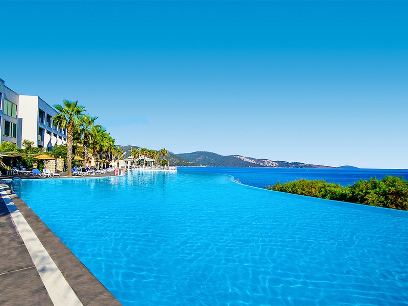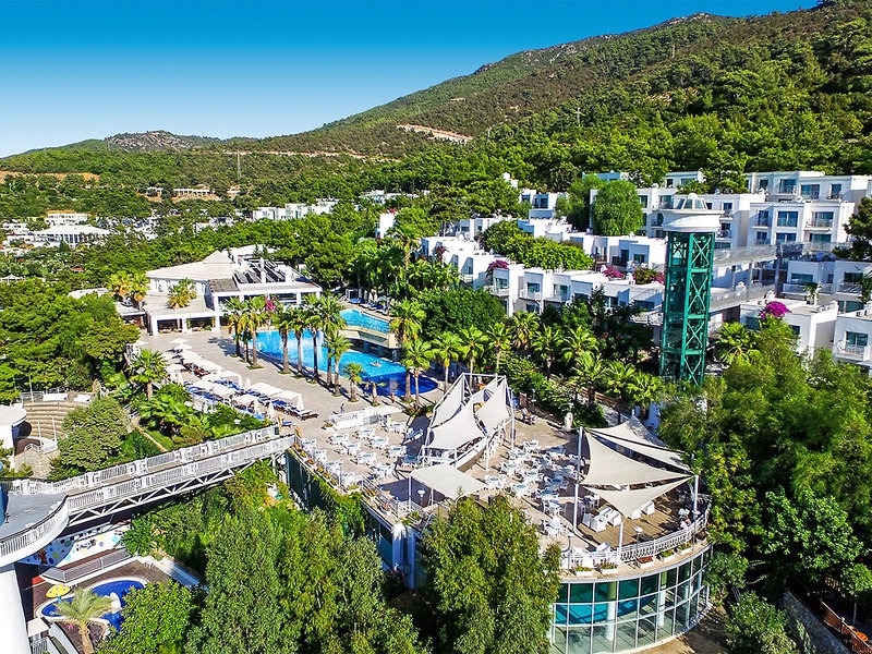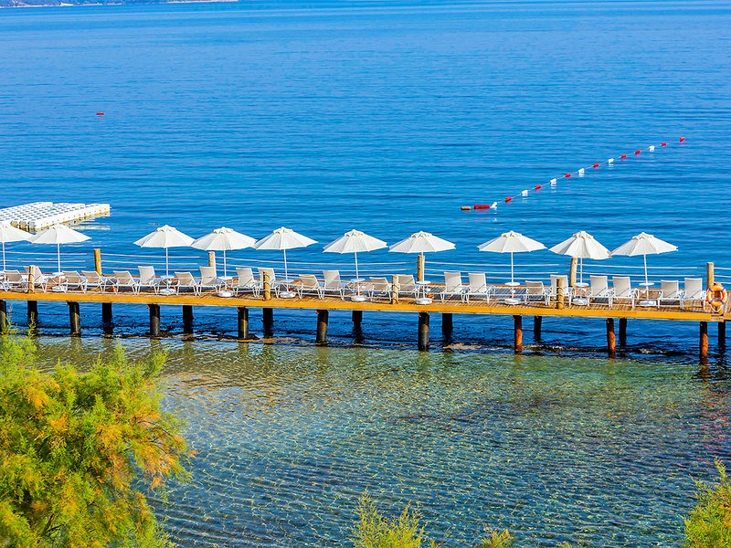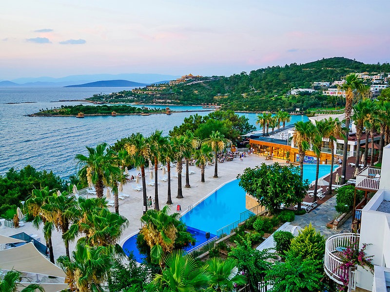 Lage & Umgebung Das familienfreundliche Strandhotel befindet sich in perfekter Lage am Hang eines kleinen Hügels und bietet Blick auf seinen herrlichen Privatstrand in der Bucht von Bodrum. Die Entfernung bis zum Stadtzentrum von Bodrum beträgt ca. 9 km und bis Milas rund 40 km. Transferzeit ab/bis Bodrum (BJV) ca. 50 Minuten, ab/bis Izmir (ADB) ca. 3 Stunden.