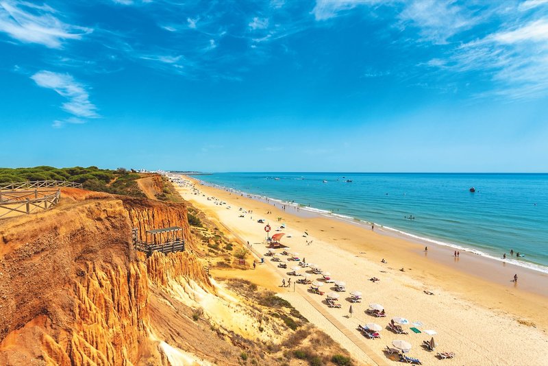 Lage & Umgebung In ruhiger Lage hoch über dem Meer an der Steilküste zwischen Albufeira und Vilamoura gelegen. Der weitläufige Sandstrand „Praia da Falesia“ ist nur einen Katzensprung entfernt und in ca. 300 m über Treppen zu erreichen. Rote Felsen, welche von grünen Pinien bewachsen sind, bilden einen eindrucksvollen Kontrast.
