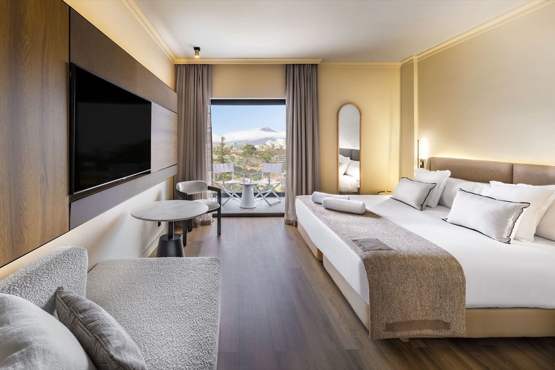 • Teide View Superior (DZX3), Doppelzimmer, im Hauptgebäude, Bergseite, Blick auf Teide, ca. 28 m², Gesamtanzahl der Räume in diesem Zimmertyp: 1, 2 Einzelbetten (90x190cm), 1 Zustellbett (100x200cm), Babybett: ohne Gebühr, Anfrage notwendig, Klimaanlage: zentral gesteuert, Fußboden: Teppichboden, Safe: gegen Gebühr, Schreibtisch, Kühlschrank: ohne Gebühr, Telefon, Internet: WLAN/WiFi: ohne Gebühr, Fernseher: Flatscreen, im Schlafzimmer, deutsches Programm, Sat-TV, Roomservice: täglich 08:00 Uhr – 13:00 Uhr, 16:00 Uhr – 20:00 Uhr, gegen Gebühr, Reinigungsservice: täglich, ohne Gebühr, Badewanne oder Dusche, WC, Bademantel: gegen Gebühr, Slipper: gegen Gebühr, Föhn, Terrasse: mit Liegestühlen